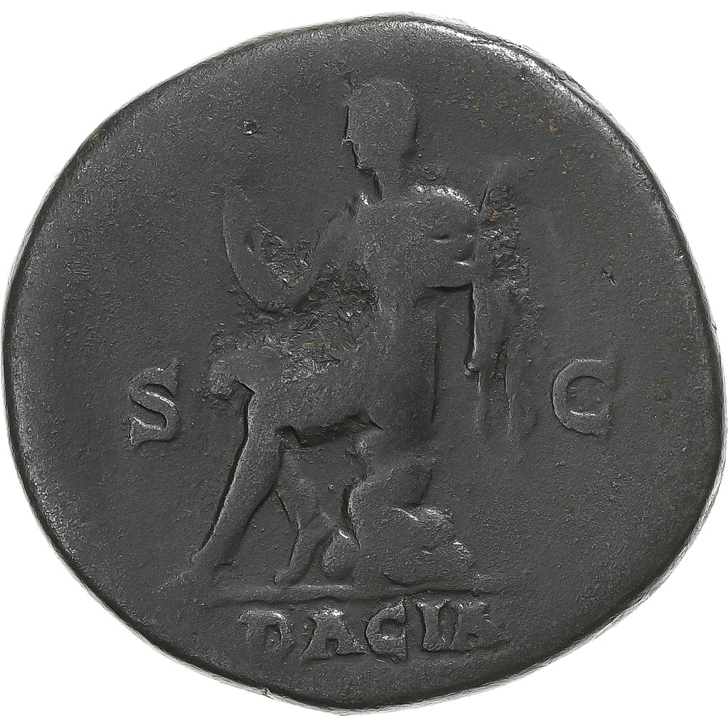 Dacia sentada a la izquierda sobre rocas, con el pie derecho apoyado en un yelmo, sosteniendo estandarte y hoz. HADRIANVS AVG COS III P PS C // DACIA 14,1 gr