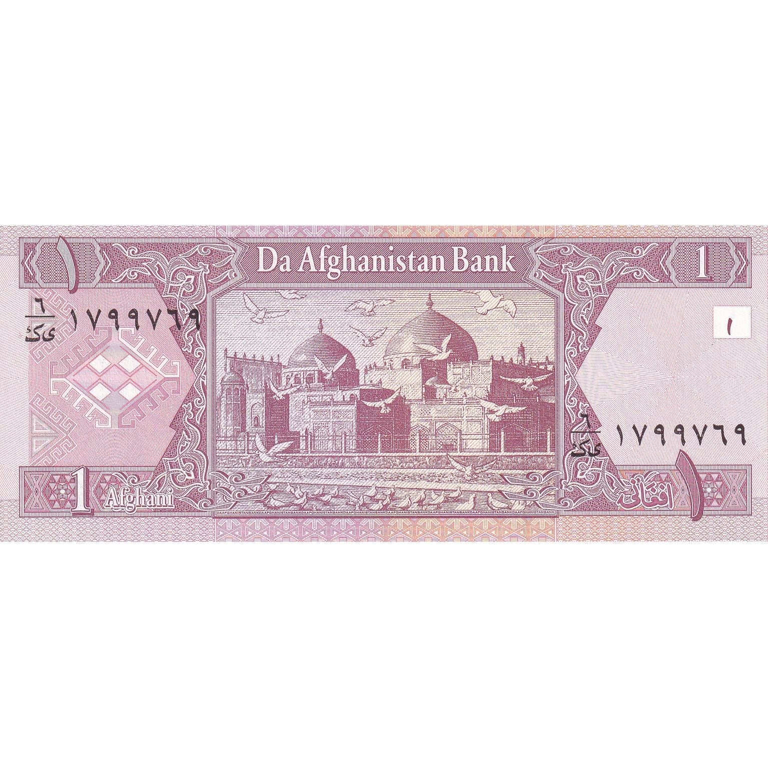 Escudo del banco con jinete en la esquina superior izquierda. El nombre del banco rodea una moneda antigua, con un par de cornucopias debajo. La Mezquita de Mazar-i-Sharif en el centro. Inscripción en color púrpura.
