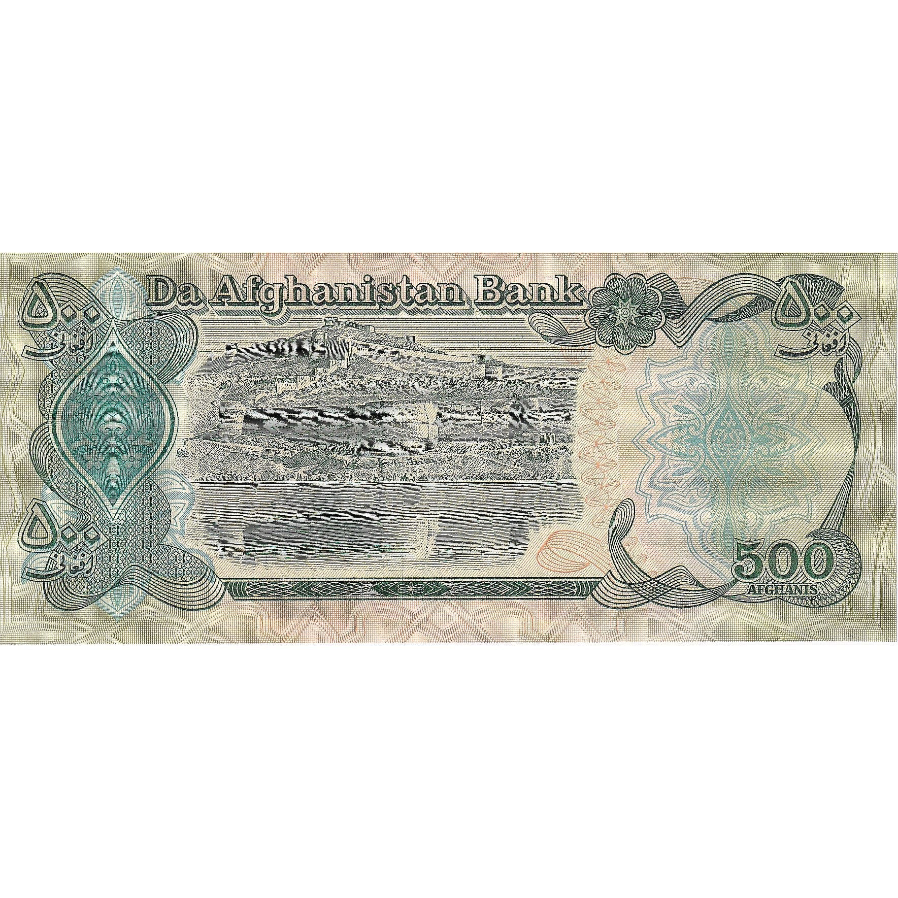 Escudo del banco con jinete en el centro en la parte superior. Jinetes compitiendo en Buzkashi a la derecha; Fuerte de Kabul a la izquierda, en el centro. Granate, verde oscuro y marrón oscuro con fondo colorido. Verde oscuro sobre fondo colorido.