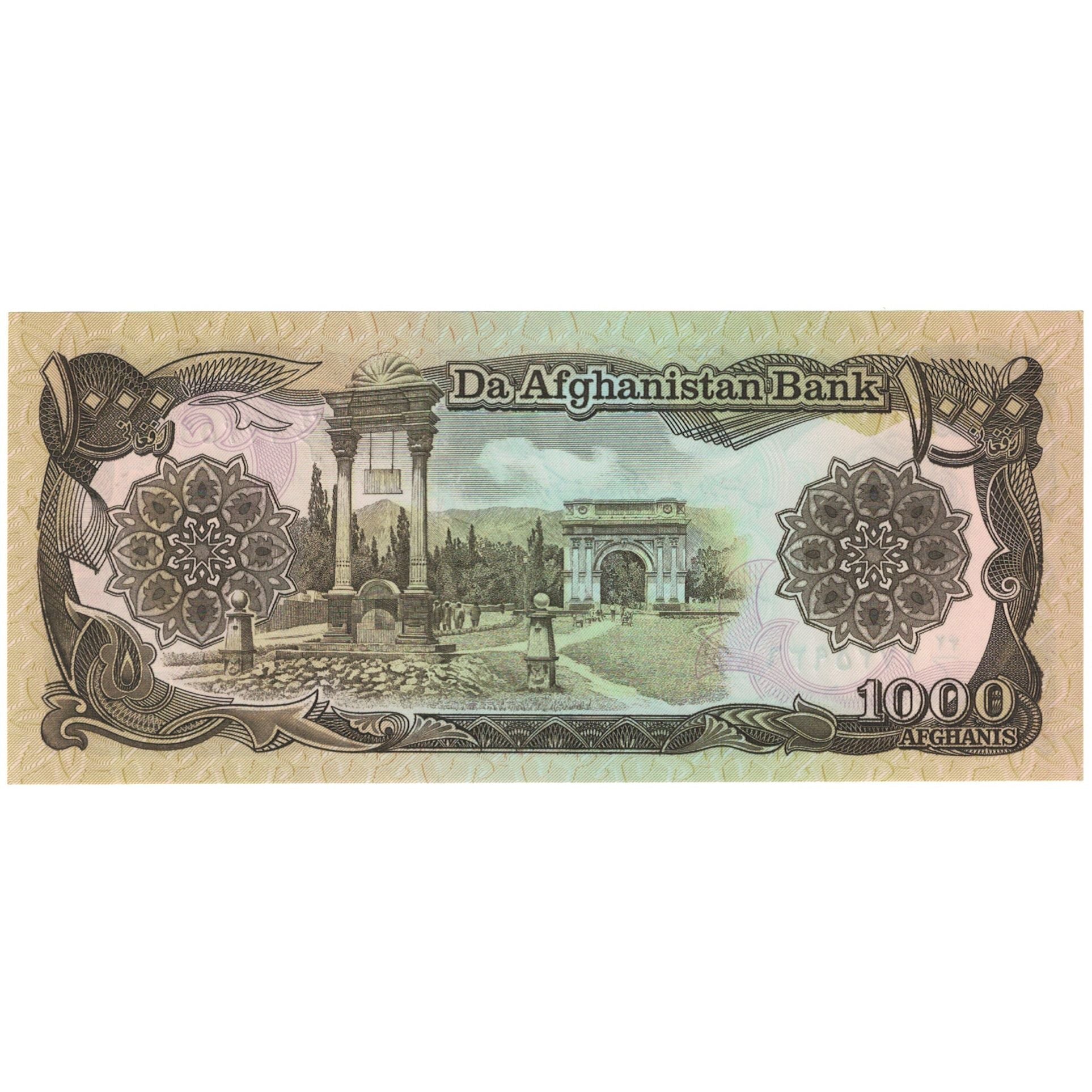 Escudo de armas del banco con un jinete en la parte superior central. La Mezquita de Mazar-e-Sharif a la derecha; el Arco de la Victoria cerca de Kabul, a la izquierda, en el centro. Marrón oscuro y rojo violeta intenso con fondo colorido.