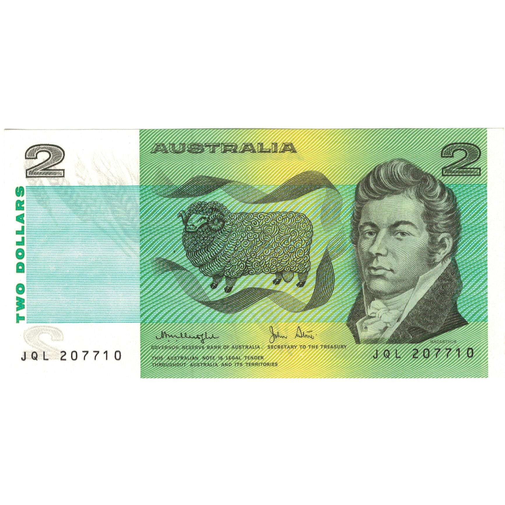 John MacArthur a la derecha, con una oveja en el centro y el texto "COMMONWEALTH OF" en el título. William Farrer a la izquierda, con el trigo en el centro. Negro, con letras en verde, azul y amarillo.